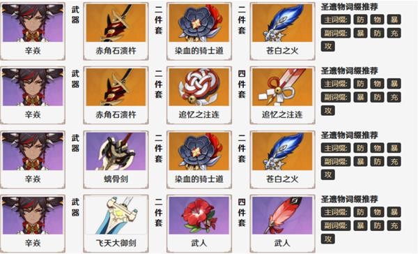 辛焱圣遗物选择「苍白之火」四件套也是可以的,但需要辛焱开启三级护盾的后续伤害来触发四件套效果,可惜辛焱元素战技给予的护盾值并不高,面对高难环境容易秒破,如果没有这些顾虑,佩戴「苍白之火」四件套是最合适的。