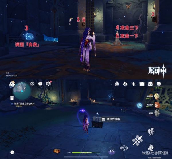 12、按照顺序先触发1和2开关,然后到3处调至白夜,接着到4处攻击三下,5号机关关闭,最后攻击一次6好点位即可打开通道。到达密室击败敌人即可获得精致的宝箱和碎片
