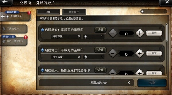 这里先说一下自选五星的兑换,在兑换所中找到“导片”大类然后看“启程的导片”,接下来就可以在右侧选择换哪位五星角色了,我到现在都没换,等歪得差不多了再说。