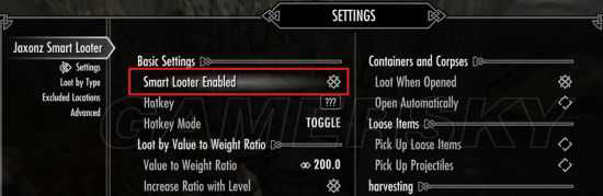 进游戏,在MCM选单里找到『Jaxonz Smart Looter』这项,勾选『Smart Looter Enabled』这项启动模块。