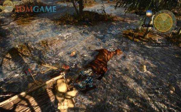 和这位商人交谈,他说在沼泽中遇到怪物,货车翻了,马匹被怪物给吃了。他委托杰洛特前往沼泽,从货车那里取回一只小盒子。