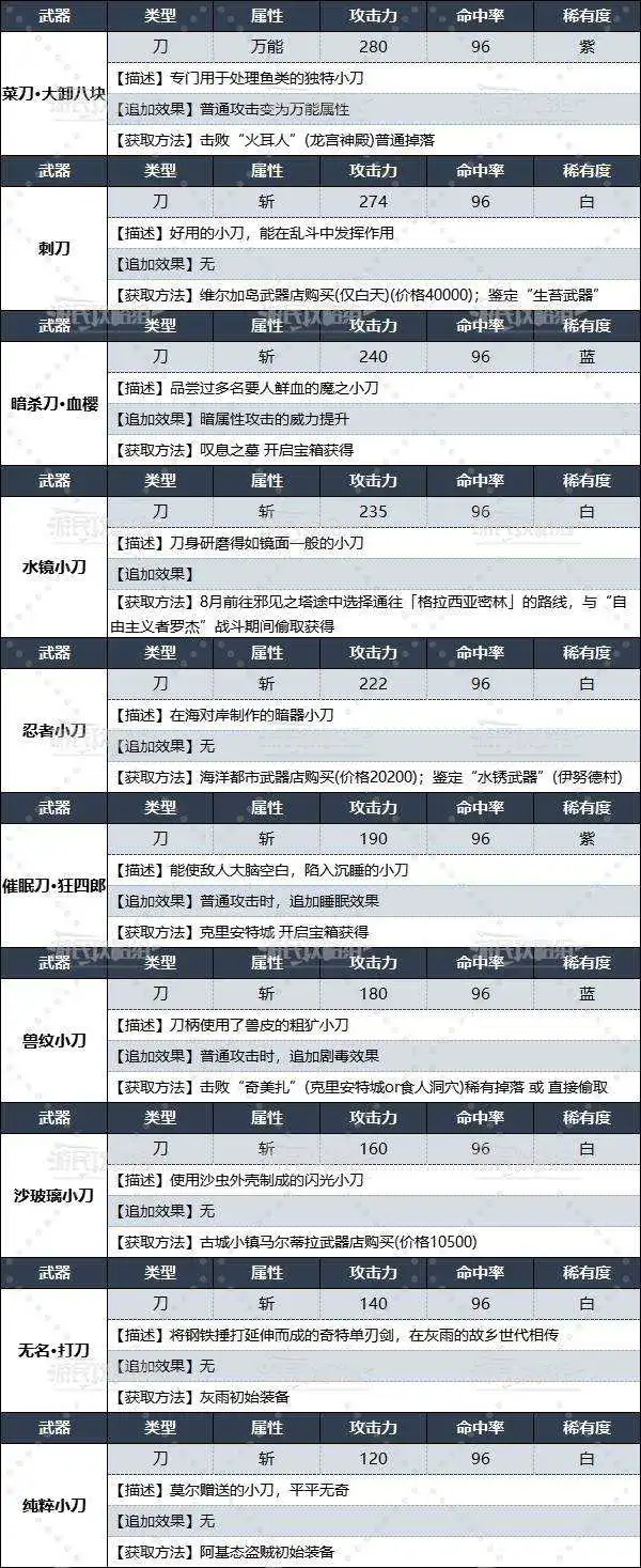 《暗喻幻想》中盗贼系统下的阿基态可以装备小刀,许多小伙伴可能还不太清楚一些强力小刀该如何获得,下面就为大家带来《暗喻幻想》全小刀数据及获取方法,希望对大家有所帮助。