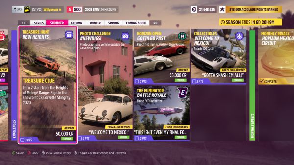 挑战任务没有车辆限制,目前也难度不大。之后如果有复杂的任务会特别介绍。马拉松任务也和地平线4没有太大区别,目前也没有马拉松商店,在此先忽略。