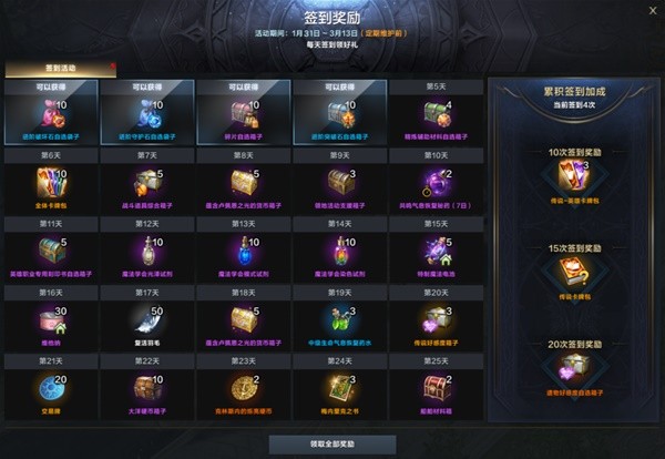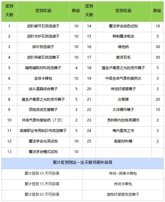 以下为本次签到活动中详细的奖励类型与数量,本次活动奖励单账号仅可领取一次: