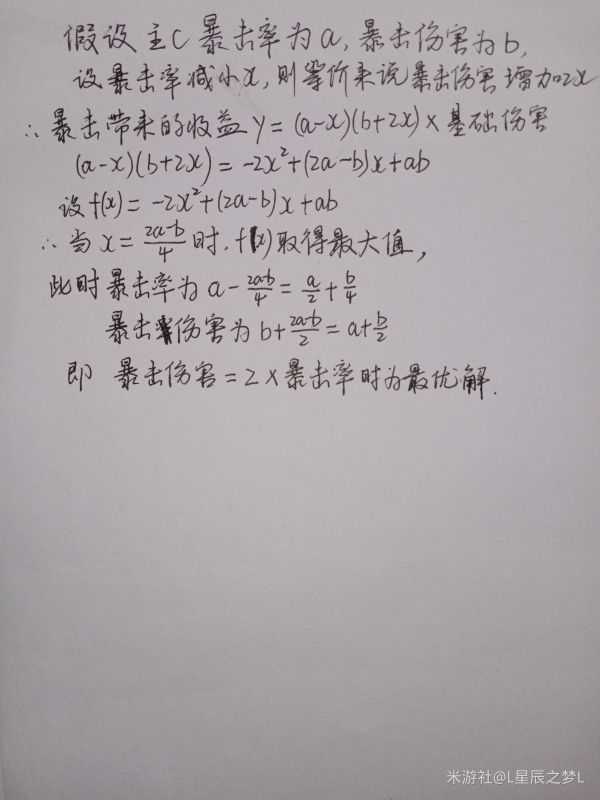叠满暴击率和暴击伤害才能使主c的输出最大化,然后我要告诉大家为什么比值一比二才是最优解,如图: