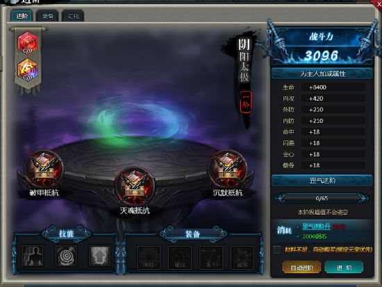 (3)鼠标移动至“进阶”按钮时,左侧显示玩家当前阶数的罡气形象,右侧进阶界面显示玩家下一阶罡气形象,并且属性会出现下一阶的属性加成哦。