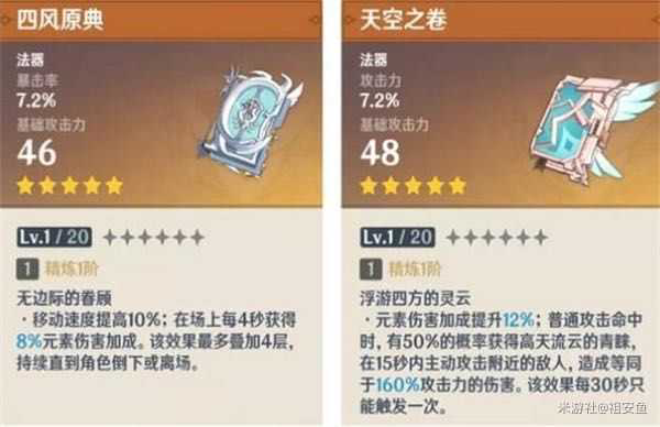 站场的主c或者组队时候推荐四风原典,如果是打副c或者工具人就推荐天空啦。都满强力的,抽到哪个用哪个就可以了。属性上四风攻击面板低一些,但是有个暴击率,80级的四风有30的暴击率加成,着实顶,让你的圣遗物难度下降8个度。天空书就是面板之王,攻击真的好高好高。