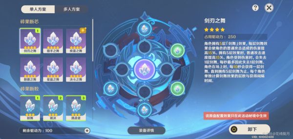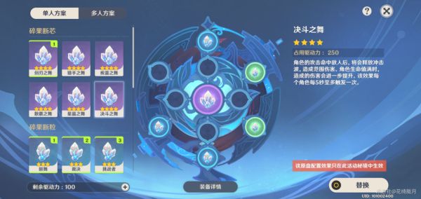 剑刃之舞:紫色品质,唯一装备,负重250,入场获得五层剑舞,每层剑舞将使角色普通攻击伤害提升15%,上限五层,剑舞层数满层时会提供额外15%的攻速,但是受到伤害会损失层数,这就意味着需要长时间护盾来维持剑舞的效果,当使用迪卢克或者雷泽这种普攻占比较高的角色时有奇效,不过需要绑定一个强力盾系角色例如钟离,迪奥娜~