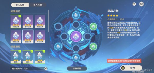 星晶之舞:紫色品质,唯一装备,负重250,角色拾取结晶时必定触发500%倍率的小型冲击波,并且提供40%的全队岩伤加成,在双岩体系下异常强大的结晶相关增益,对于钟离,凝光,阿贝多,诺艾尔等岩属性角色提升显著~