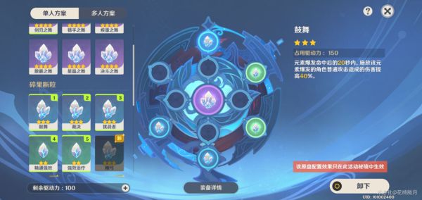 鼓舞:蓝色品质,可和其它品质一起装备,负重150,元素爆发命中敌人20秒内角色普攻伤害提高40%,对于雷泽、迪卢克提升较大,看情况选择~