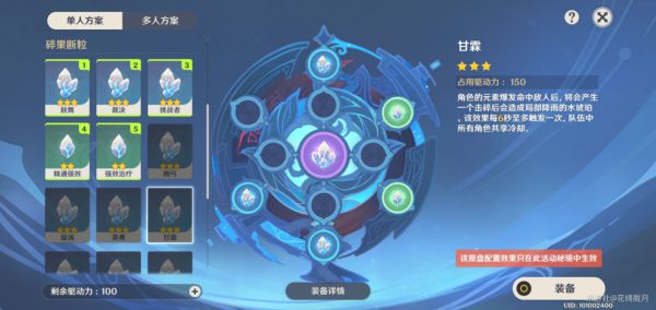 甘霖:蓝色品质,可和其它品质一起装备,负重150%,元素爆发后产生局部降雨的水琥珀,个人倾向联机配合使用冰元素高频附着的队友时使用,单机作战价值较低~