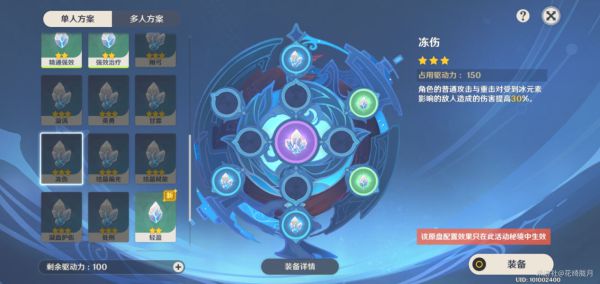 冻伤:蓝色品质,可和其它品质一起装备,负重150%,对于冰元素附着的敌人普攻与重击伤害提高30%,对于甘雨,凯亚这种长时间挂冰的角色提升非常大,队伍主力为这两个角色时可优先选择~