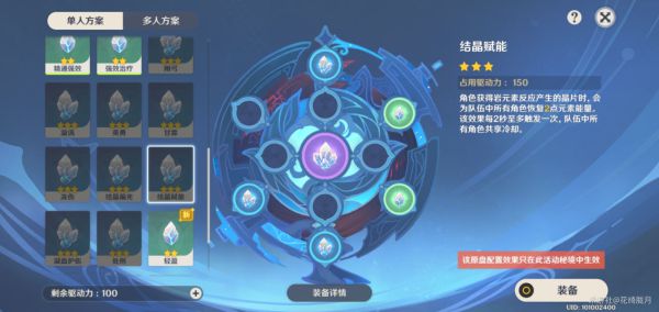结晶赋能:蓝色品质,可和其它品质一起装备,负重150,结晶反应全队充能机制,同理结晶偏光,根据队伍配置选择~