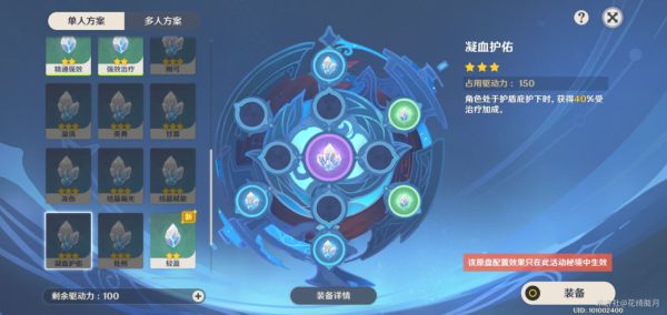 凝血护佑:蓝色品质,可和其它品质一起装备,负重150,适合迪奥娜,钟离等盾系角色,如果作战环境同时对于护盾和治疗量有需求可选~