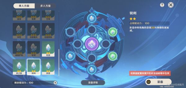 锐利:绿色品质,可和其它品质一起装备,负重100,30%全队物伤加成,对于雷泽为首的物理系角色提升巨大,物理队攻坚优先选择~