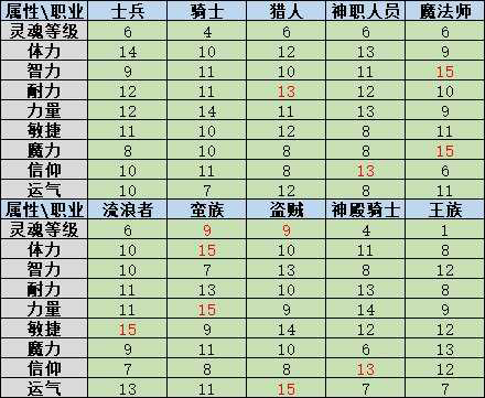 下图为初始职业的属性,强烈建议选择王族,这个职业的初始装备非常优秀,其中戒指甚至在游戏中期要6W魂才能购买,绝对是不折不扣的极品角色,并且只有一级,升级也非常方便。