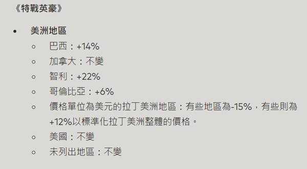 价格单位为美元的拉丁美洲地区:有些地区为-15%,有些则为+12%以标准化拉丁美洲整体的价格。美国:不变