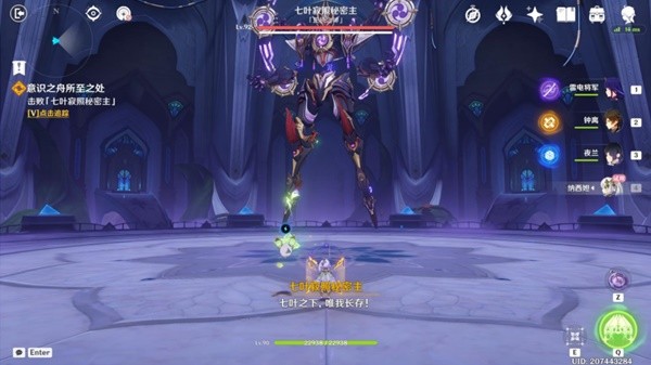 注意开护盾/回血,躲避地上的所有技能,一直拾取图中指引的能量块,给小精灵充能,充满后,会变成元素战技,可用来拍照攻击「七叶寂照秘密主」阶段②的护盾