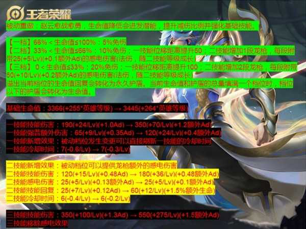 赵云本次调整一句话概括就是“血量越低,战斗力越强”,出场自带5%基础免伤,在生命值低于33%以后免伤效果变为20%,并且一技能位移增加100码,二技能附带的伤害也更加可观,增加了一、二技能的收益占比,弱化了三技能的作用!
