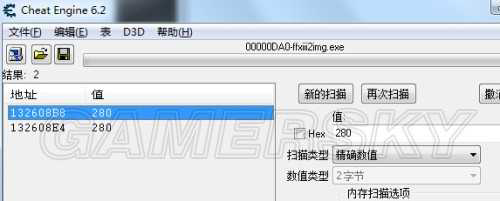 ■首先打开CE,CE使用2字节类型,搜索物攻266,然后吃个球升级一次,看到物攻变成了280,搜索之,得到下左图