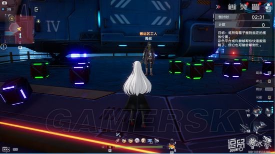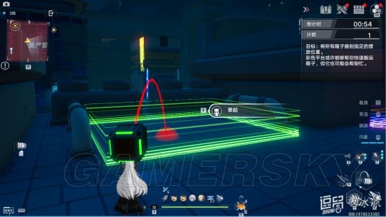 玩法:游戏开始后起始位置会出现10个箱子,5个紫色箱子,5个绿色箱子。把所有的箱子扔到对应颜色的摆放位置可获得积分。