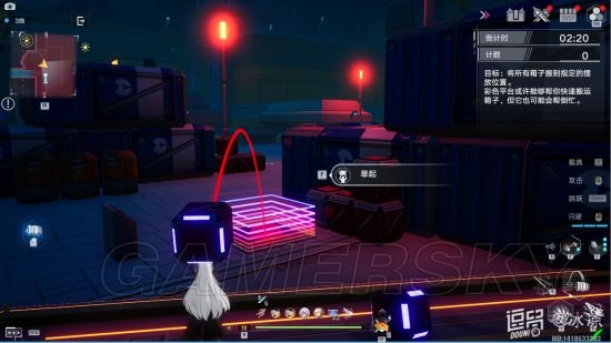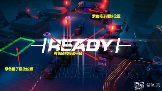 提示:彩色平台为随机传送点,把箱子扔到彩色平台,箱子会随机传送到其他平台附近。