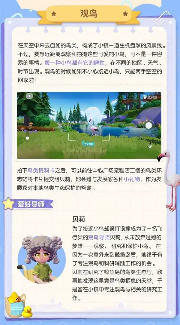 正文 2025年《心动小镇》观鸟玩法介绍 心动小镇怎么拍鸟 游戏小天使 /2025-01-11 18:38:11 /56 浏览量 0111 《心动小镇》中各种娱乐玩法非常多,其中观鸟玩法有什么需要注意的地方呢,下面请看官方带来的《心动小镇》观鸟玩法介绍,希望能够帮助大家。 败荷零落,衰杨掩映,岸边两两三三,浣沙游女。 -- 展开阅读全文 --