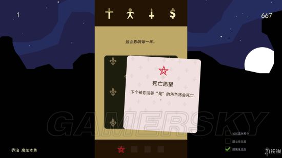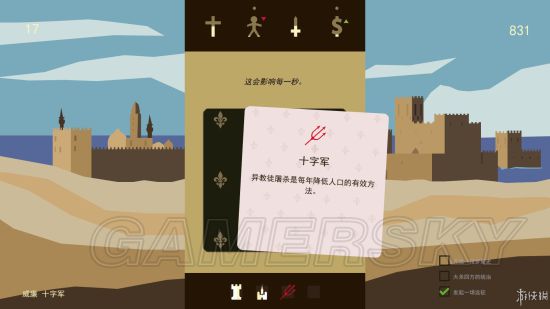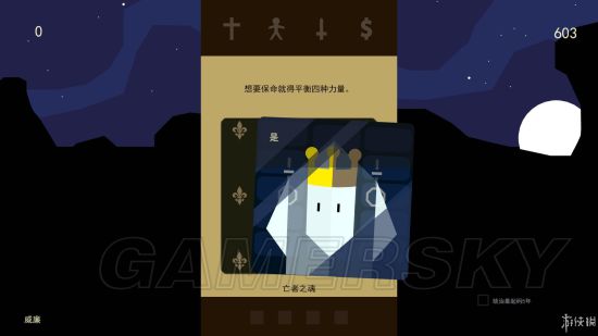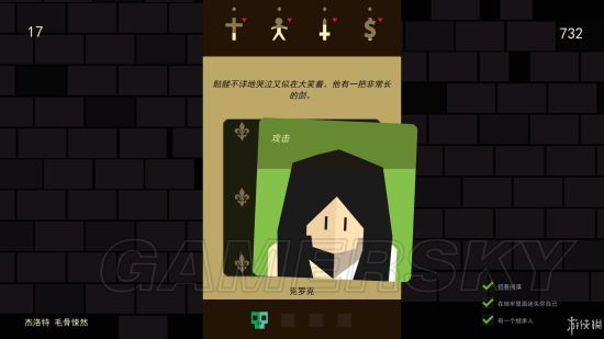 遇到某些特殊的卡片上的人物,还会进入收藏列表,在列表中可以看到已经遇到的角色与形象,还能查看到未出现的卡片数量。游戏界面的上方显示的是国家的四个指标的状态,下方四个格子则显示的是各种BUFF状态,buff可能的持续时间可能会持续好几世也可能只会持续当前一世。