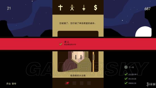 一开始已经提到,游戏的美术内容较少,不过就游戏内的画面表现来看,还不算太糟糕,手绘简单风格,虽然忽视了细节的处理,但对出人物特色表现得还比较传神。期间可以遇到各种各样的角色,不仅囊括了牧师、女巫、将军、小丑、狗等在内的设定,还会出现在地牢、骷髅等要素。