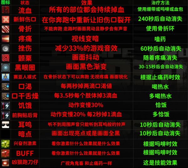 《逃离塔科夫》游戏中玩家如果不小心受伤将会让角色面临一些受伤状态,不同的受伤状况也会让玩家们十分头痛,那么怎么解除这些异常状态呢?请看玩家“熊猫杀手”分享的《逃离塔科夫》人物异常状态介绍及治疗方法。希望能为各位玩家带来一些帮助。