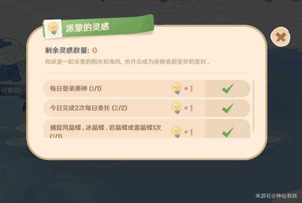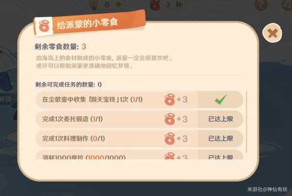 活动主要有两种道具,分别是派蒙的灵感和给派蒙的小零食,获得方式便是活动给的小任务,这个我相信大家都可以完成。