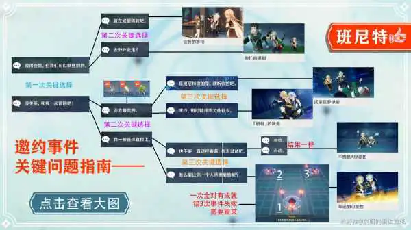 《原神》1.4版本更新了邀约事件玩法,玩家们可以跟已开启邀约任务的角色一起做专属任务,其中班尼特还没有收集全结局的玩家请看下面“前面的躯让我来”分享的《原神》班尼特邀约核心选项一图流攻略,希望能够帮助大家。