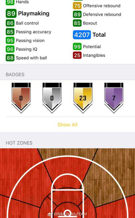 全面无弱点的强悍。非要挑刺,52的盖帽太低了,另外88的带球速度需要穿一双钻鞋来提升一下。自带7个紫徽章:隔扣达人、空接终结者、无情终结者、空中魔术师、挡拆战术大师、单人快攻和追帽专家。