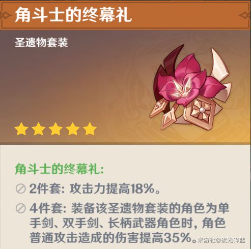 不选择四件套的原因是骑士四件套的效果首先要击杀才能触发,在后期打单精英关卡完全无用,强化重击的单次伤害也和流月针完全不搭,而角斗士四件套的效果只能提升普通攻击,也无法作用到流月针的附加伤害。