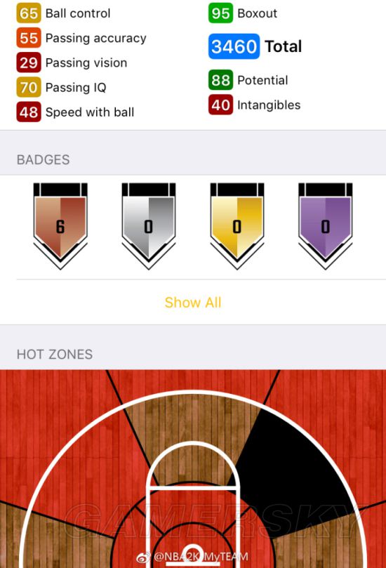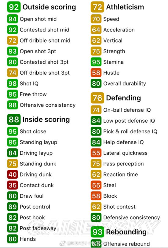 这是张优异的空间型内线卡片,7尺的身高拿去打中锋效果更佳。高达93的空位三分和90的受干扰三分,以及94的防守篮板,可以很好的完成本职工作。可以看成是防守弱化版的波神,当然价格也相对亲民一些。