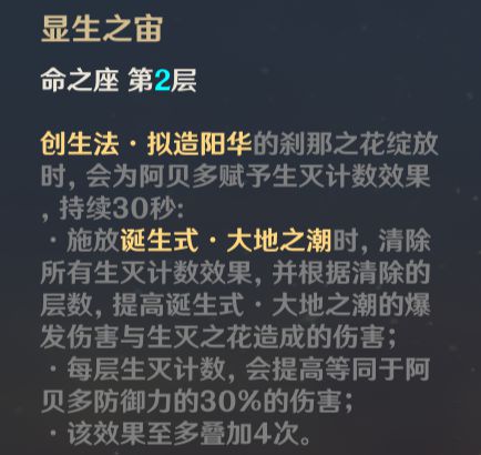 阿贝多的核心命座,拥有二命的阿贝多大招爆发伤害和生灭之花的伤害,也能和刹那之花一样吃到防御力的加成,提高了阿贝多的输出能力(加成的伤害可以享受到宗室2件套的增益)