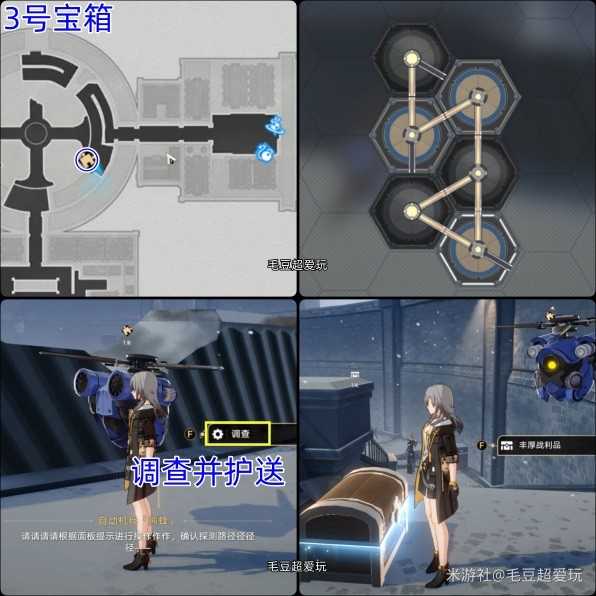 拿到2号宝箱后朝身后看,这里有个损坏的机器人,我们修好、调查并护送它,就可以拿到宝箱啦!