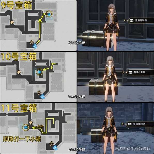 拿完8号宝箱后朝地图北面前进,按照毛豆下图标记的路线前进即可,这3个宝箱都没有难点,唯一值得注意的就是要顺手打一下小猪!
