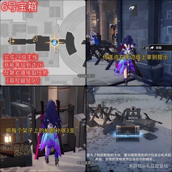 需要接取任务〖冒险鼹鼠队〗,需完成开拓24级的主线任务,以及开拓等级到达26级后在磐岩镇接取。任务进度在寻宝阶段时来到“禁区前线”传送点,在右手边的墙壁上可以拿到任务提示,接着我们需要补齐架子上的“枪支”,每个架子都要补齐3支,完成后拿到6号宝箱,没有宝箱提示代表还有架子没补齐,仔细找找!