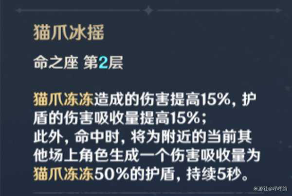 很多的玩家都忽视了这样一个可爱的猫咪,或者是在公子池并没有获得迪奥娜的情况下,自然的忽视了这个角色。在联机的情况下,绝大多数人的第一印象都是迪奥娜的2命加盾效果。