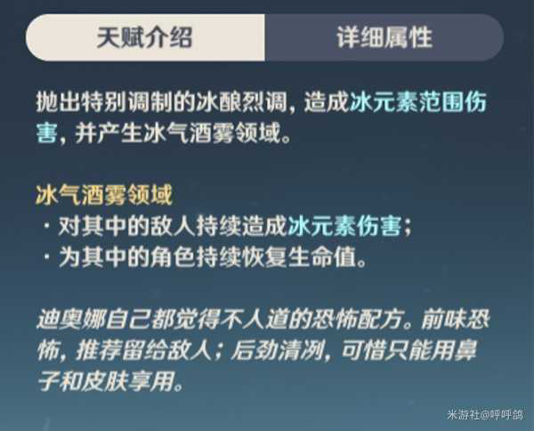 介绍完技能之后各位看官应该就已经大致了解迪奥娜的一个技能机制,相比于战斗天赋,迪奥娜的固有天赋“猫尾隐藏菜单”和“滑稽百出的醉相”就显得有些鸡肋。具体技能效果可以看游戏内的介绍。