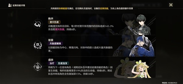 (1)延奏技能,大致分4种类型,伤害-增伤效果-治疗(增伤技能有独立也有与治疗一起)-辅助(辅助包括回复能量,增加共振度削减等)一般效果只生效下一位角色1