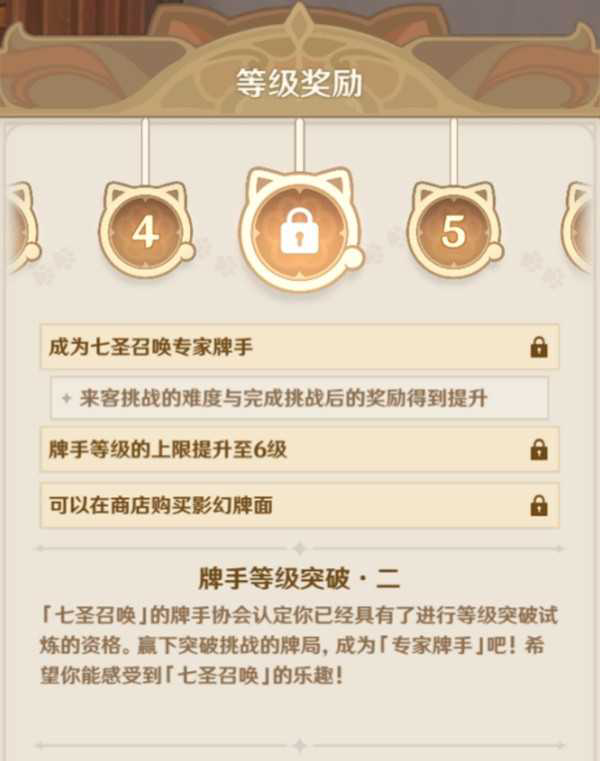 在玩家牌手等级达到2、4、6、9级时需要完成牌手等级突破任务,才可以继续升级的,这一点和大世界等级的突破任务一样,所以小伙伴们要注意哦。