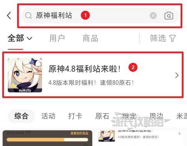 打开小红书,在上方搜索栏输入【原神福利站】。下方第一个卡片样式的搜索结果,进入活动页面。