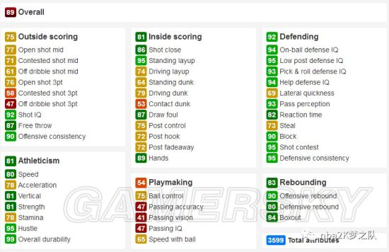 这张紫色斯托克顿则是一张能够使用的复古卡,虽然他的数据总分仅有3320,比上面的红卡还低,但其中的控卫关键属性还是及格的,比如投篮(中投84+三分85)、速度(三速91)、控球(90)、传球(95),均值91的防守和93的抢断更是让他保持了自身一贯的防守能力。而且他还有着不错的热区和10枚标准的金章。
