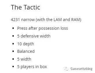 这里重点说一下防守深度10,大家不要被游戏内EA相应的动画说明迷惑了。这个防守深度10,并不是说整体阵型压的非常靠前,后卫会站到中圈,不是这样的。防守深度设为10,你的阵型整体会稍微前压一些,后卫站位还是正常的。防守深度这个数值影响的应该是后卫和中场之间的空间,设为10,后卫和中场之间压缩的会更紧密一些。如果你想调低,也可以,但从玩家的反馈来看,最低设为7,再低的话,就失去了这个战术板的精髓。