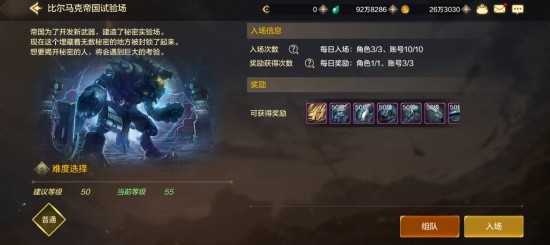 比尔马克帝国试验场是DNF手游当中四大远古副本之一,副本的进入等级为50级,打开主页面右侧的【委托】,选择【比尔马克帝国试验场】即可进入。可以在通关可掉落材料【闪亮的泰拉石】,更有一定几率掉落成品神器装备、附魔卡片。