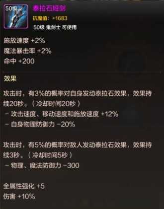 泰拉石武器属性为全属强+5,伤害增加10%,攻击时5%概率使自身物理防御力减少20%的情况下增加攻击、移动、释放速度12%,5%概率减少敌人300点物理和魔法防御力。