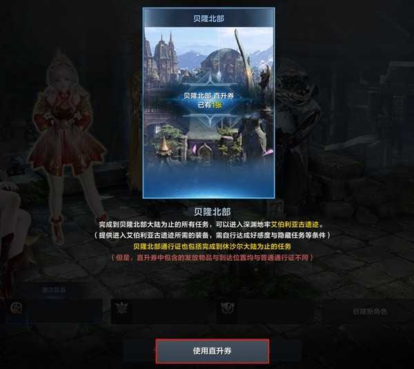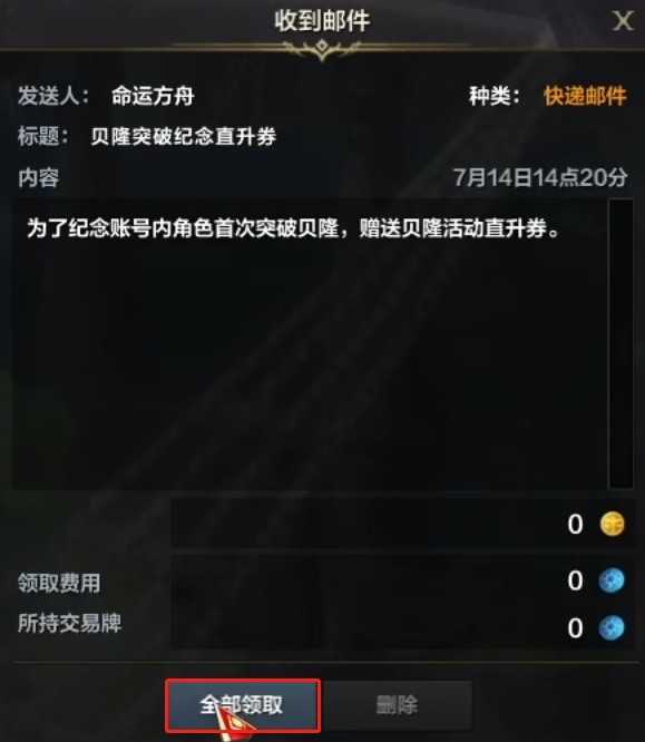 当冒险家们在游戏中首次完成贝隆主线后,会收到一封邮件:贝隆突破纪念直升券,在领取邮箱中的物品后,就可以在背包中使用直升券啦。