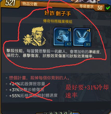 这是我目前用的职业模组,用刽子手就行,天赋怎么配的随意,主要是为了他那个红字特效,给的暴击伤害,词条一定追求+31%冷却速率,我没有。
